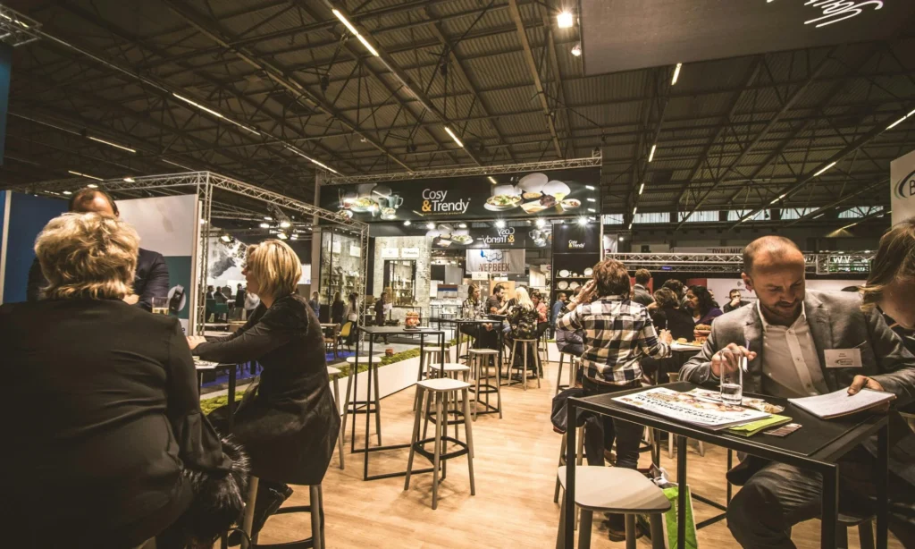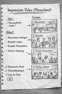 I will film general shots of your booth, a product overview, networking scenes, special features (such as DJs, foosball table, etc. – if available), visitors, employees, etc., and general impressions.