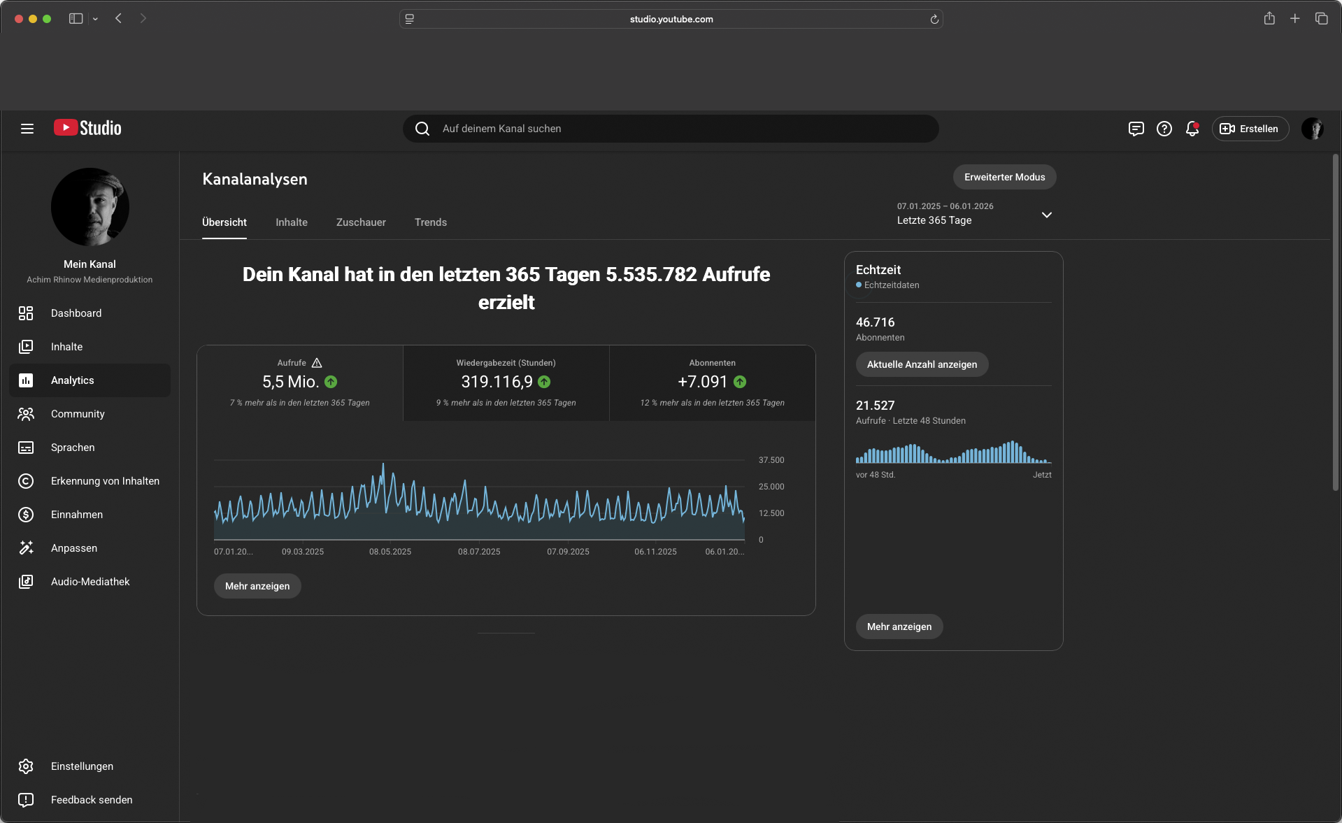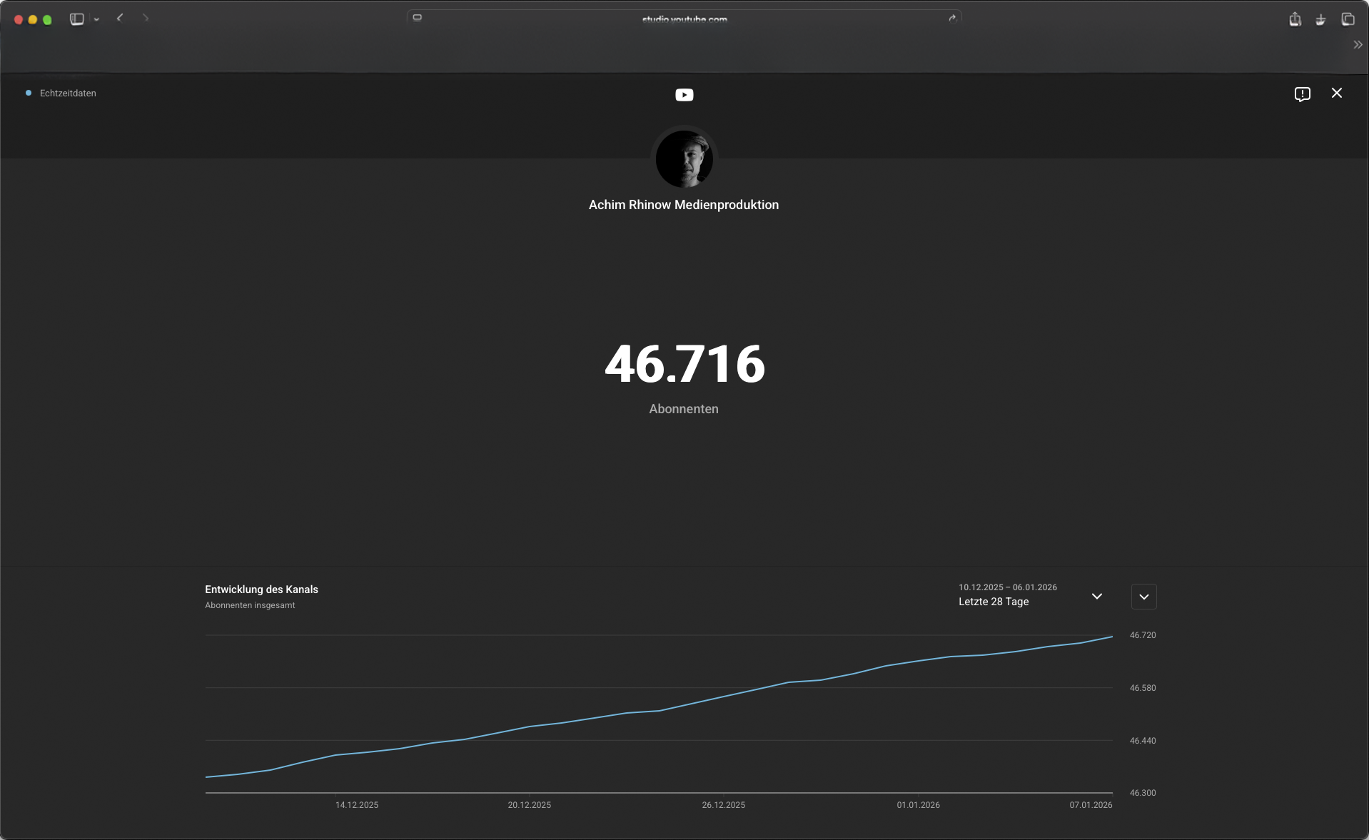 Allein im letzten Jahr erzielte mein YouTube-Kanal 5,5 Millionen Aufrufe, verzeichnete einen Zuwachs von über 7.000 Abonnenten und kommt aktuell auf 46.716 Abonnements. Ihre Videos werden damit nicht isoliert ausgespielt, sondern strategisch in ein performendes Umfeld eingebettet – für nachhaltige Sichtbarkeit und messbaren Marketing-Impact weit über die Messe hinaus.